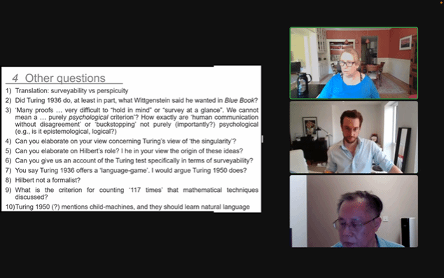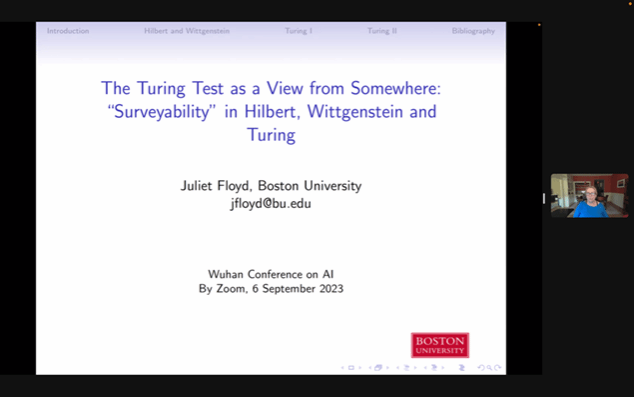 本网讯(通讯员李懿迪)9月6日晚,应bcw8白菜网陈波教授邀请,美国波士顿大学哲学系讲座教授、波士顿大学人文中心主任、国际科学哲学院(AIPS)通讯院士朱丽叶·弗洛依德(Juliet Floyd)做了题为“维特根斯坦、图灵和可检测性(Wittgenstein, Turing, and Surveyability)的线上讲座,它属于新设立的“bcw8白菜网科学技术哲学论坛”第一讲。讲座由陈波主持,北京大学哲学系助理教授王小塞(Sebastian Sunday Greve)评议。来自国内外的400余名听众参与本次线上讲座。